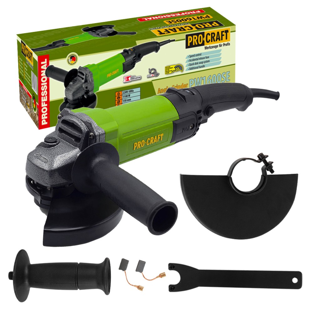 Кутошліфувальна машина Procraft PW1600ЕS 150 мм призначена для шліфування, різання і зачистки деталей з металу та інших твердих матеріалів. Потужність 1100 Вт забезпечує високу продуктивність пристрою. Характеристики моделі Наявність плавного початку роботи. Функція регулювання частоти обертів в діапазоні від нуля до 12000 обертів на хвилину. Працює при частоті струму 50 Гц. Діаметр робочого диска - 150 мм. Система швидкої заміни диска (в комплекті є монтажний ріжковий ключ). Посилений захист від пилу збільшує термін експлуатації ключових робочих вузлів болгарки. Переваги Procraft PW1600ЕS Кутова шліфувальна машина має продуману до дрібниць ергономіку. Зручна прогумована ручка повторює рельєф долоні й гарантує надійне позиціонування руки під час роботи, а також знижує вібрацію інструменту. Знімний кожух захищає робітника від іскор і знижує ризики отримання травми. Комфортна вага (2,1 кг) є ще однією перевагою інструменту. У комплектацію пристрою входить додатковий комплект запасних вугільних щіток. Демократична ціна робить дану модель болгарки ідеальним вибором для домашньої майстерні.